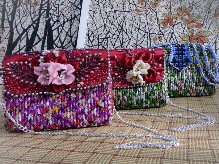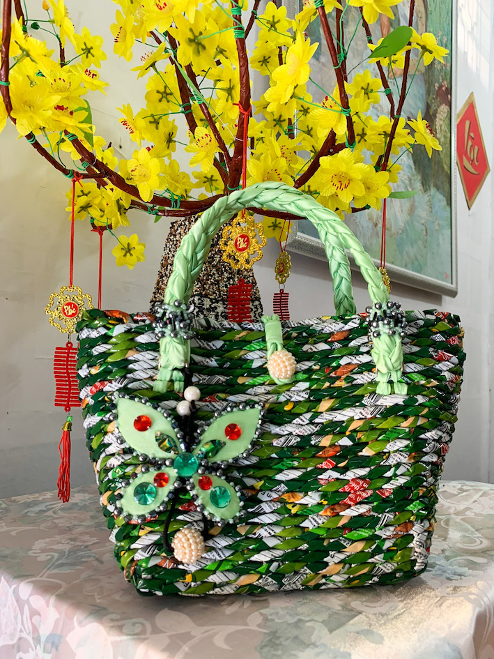 Anh thường làm túi với 100% vỏ mỳ gói, về sau anh trang trí thêm hạt cườm để tăng tính thẩm mỹ. Trong hình, chiếc túi được làm từ khoảng hơn 200 chiếc vỏ mỳ, công làm hơn một ngày.