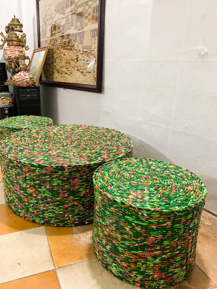 Bộ bàn ghế này hoàn toàn được làm bằng vật liệu tái chế. Phần bên trong dùng vỏ chai nhựa, bên ngoài được anh Toàn bọc bằng thảm đan từ vỏ mỳ.
