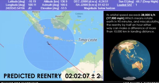 Chuyên gia Jonathan McDowell, nhà vật lý học thiên thể của Đại học Harvard (Mỹ), cảnh báo vật thể trên chuẩn bị rơi xuống địa cầu trong vài ngày nữa, và nhiều khả năng một số phần của nó sẽ không bị thiêu cháy trong quá trình tiến nhập khí quyển , và tạo ra những mảnh vỡ rải rác khắp 160 km trên mặt đất.