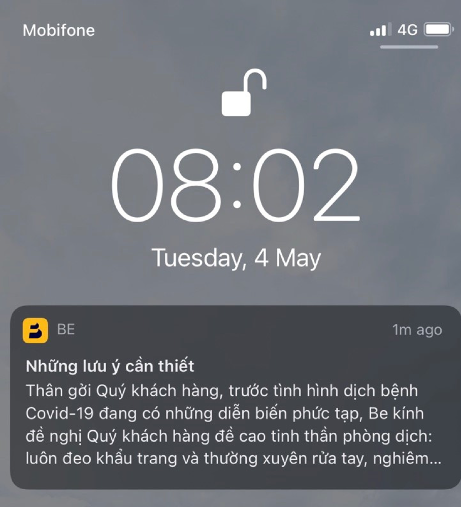 Giữa hàng loạt tin nhắn thông báo từ “người yêu Y tế” về số ca nhiễm mới, những khu vực “báo động đỏ”, yêu cầu người dân tuân thủ 5K, thì đều đặn 8h sáng mỗi ngày, trước khi bắt đầu đặt một cuốc xe mở đầu ngày mới, một tin nhắn từ người anh em - Be đã “bắn” đến hỏi thăm, dặn dò, nhắc nhở, như đừng quên đeo khẩu trang, nhớ chuẩn bị kỹ càng trước khi ra khỏi nhà, những việc làm mà anh “Be” đã chuẩn bị đề bạn yên tâm trên mỗi chuyến đi.