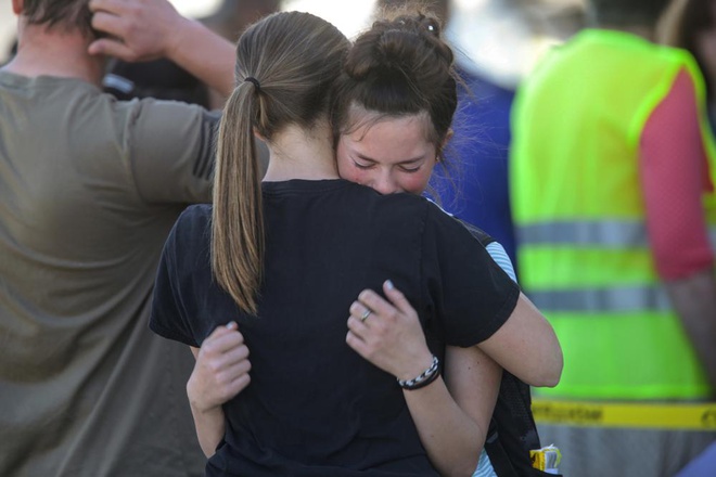 Các học sinh ôm nhau sau vụ xả súng tại trường cấp 2 Rigby bang Idaho, Mỹ. Ảnh: AP.