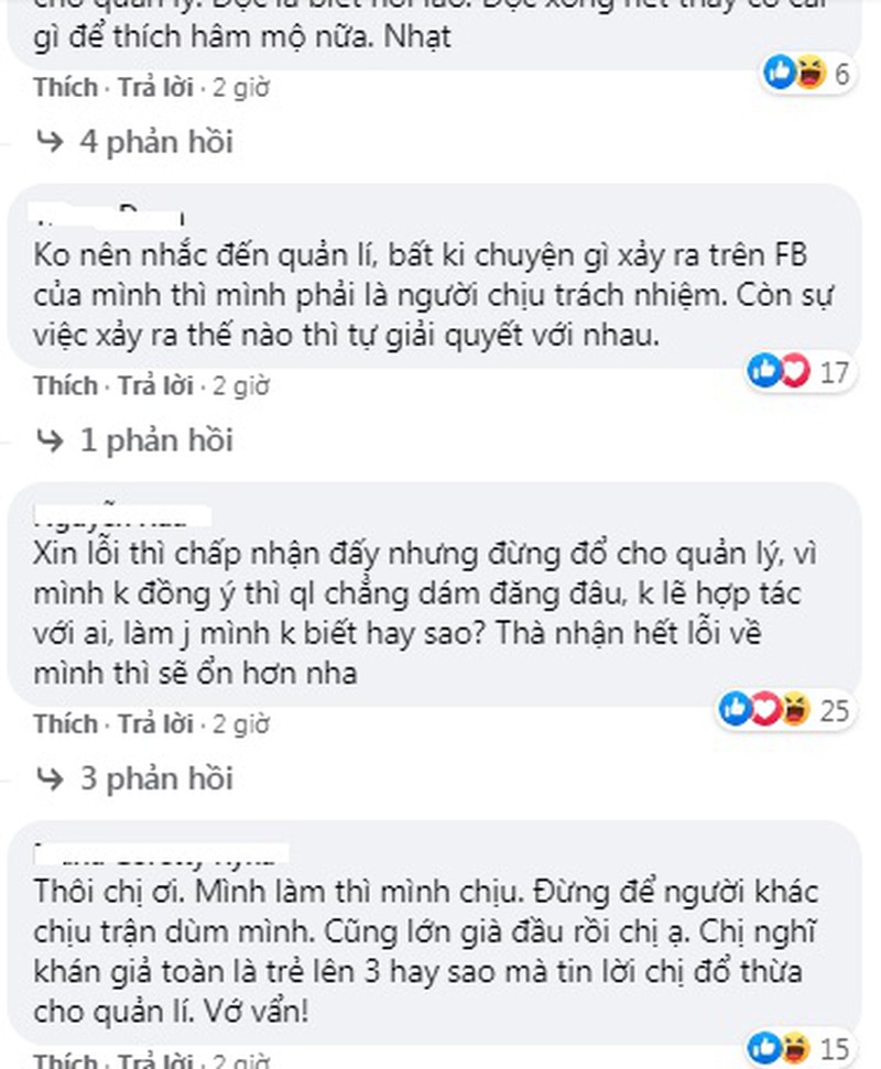 Nhiều fan cũng để lại bình luận: "Không có sự đồng ý của Nam Thư.quản lý nào dám đăng"; "Chính chủ không duyệt thì quản lý nào dám đồng ý việc quảng cáo và tự đăng. Xin lỗi mà đùn trách nhiệm cho quản lý"; "Đã xin lỗi còn lươn lẹo, người trưởng thành không bao giờ đổ lỗi nha chị Nam Thư. Thà im lặng còn hơn lời xin lỗi giả tạo này".