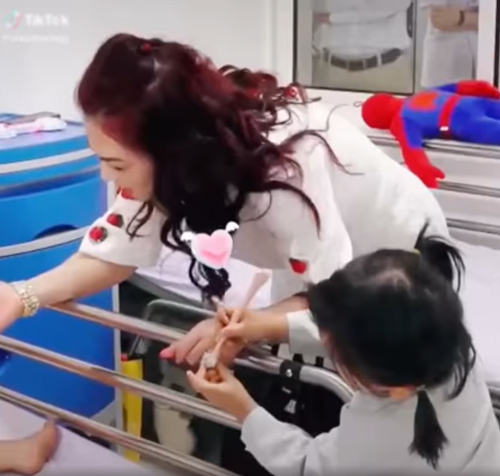 Cụ thể, trong khi bà Hằng đang hỏi thăm và chơi với bệnh nhi thì một bé gái khác đến gần và lấy bút để “cạy hột xoàn” nơi tay.
