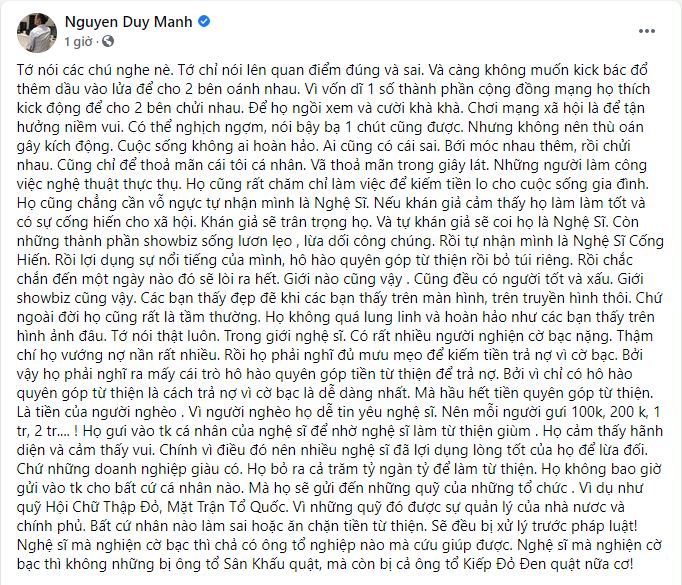 Trong bài đăng này, Duy Mạnh đưa ra những phát ngôn gây sốc về giới nghệ sĩ, đặc biệt là vấn đề liên quan đến loạt ồn ào làm từ thiện gây nhức nhối thời gian gần đây trong showbiz. "Những thành phần showbiz sống lươn lẹo, lừa dối công chúng, rồi tự nhận mình là Nghệ Sĩ Cống Hiến, rồi lợi dụng sự nổi tiếng của mình, hô hào quyên góp từ thiện rồi bỏ túi riêng", Duy Mạnh thẳng thừng chia sẻ.