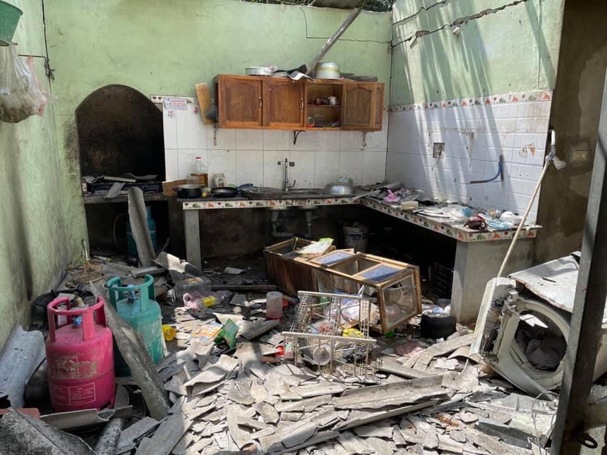 Tại hiện trường, toàn bộ đồ đạc trong gia đình bị biến dạng. Ngôi nhà cũng mất mái nhưng 2 bình ga vẫn nguyên vẹn. Bà Nguyễn Thị Liên, Phó bí thư HĐND thị trấn Thác Bà, cho biết thời điểm xảy ra vụ việc, vợ và gia đình vợ anh Q. ở phòng khách.