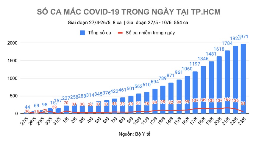 Theo thông tin từ Trung tâm Kiểm soát Bệnh tật TP.HCM (HCDC), từ 18h ngày 22/6 đến 6h ngày 23/6, TP.HCM có thêm 51 trường hợp mắc Covid-19 với mã số 13732 - 13782. Trong đó có 41 bệnh nhân là F1 tiếp xúc các ca mắc Covid-19 đã công bố, 10 trường hợp chưa rõ nguồn lây được phát hiện trong quá trình xét nghiệm sàng lọc tại bệnh viện. Họ cư trú tại các khu vực: Quận 4 (1), quận 8 (4), quận 10 (4), TP Thủ Đức KV 2 (1).