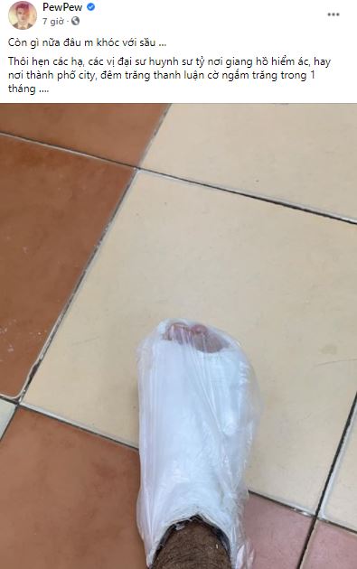 Mới đây, PewPew chia sẻ bức ảnh bị chấn thương ở chân do đá bóng khiến người hâm mộ bất ngờ. Cụ thể, PewPew cho biết chân phải của anh bị gãy và đang phải bó bột để điều trị. Vì lẽ này, PewPew có thể sẽ phải nghỉ livestream trong 1 tháng để hồi phục.