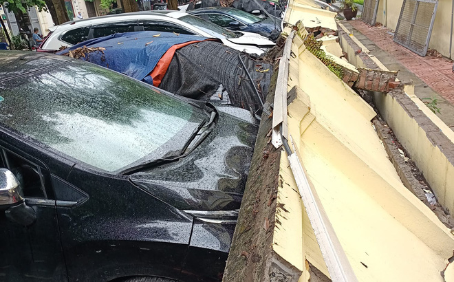 Một bức tường dài hàng chục mét bất ngờ đổ sập trong cơn mưa rào, đè lên hơn chục chiếc ô tô ở quận Cầu Giấy, Tp Hà Nội.