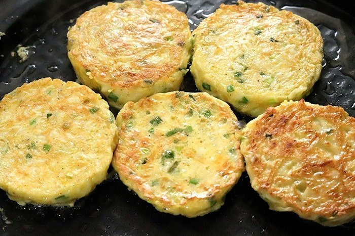 - Làm nóng dầu ăn trong chảo chống dính, sau đó múc từng thìa bột bánh vào, sau đó ấn dẹt xuống.