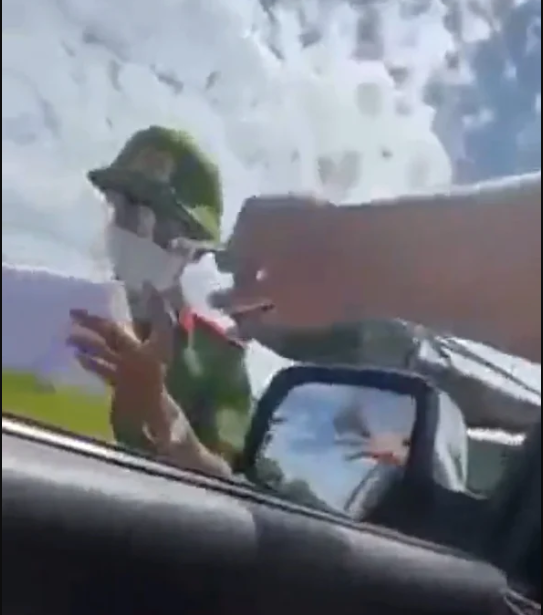 Bất ngờ một cán bộ mặc áo khoác xanh tiến đến và yêu cầu cán bộ công an cho tài xế quay đầu xe, không được qua chốt kiểm dịch vì lý do “tiền là mặt hàng không thiết yếu”.