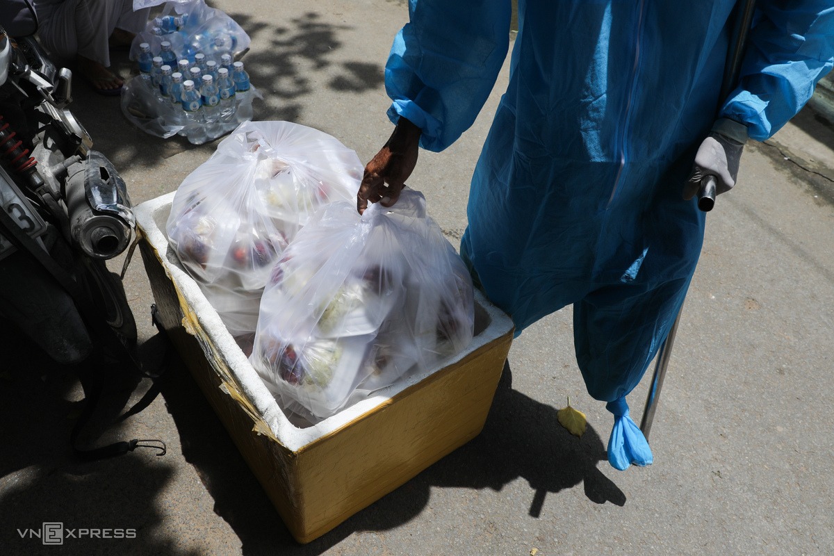 Trên khuôn mặt in vết hằn của khẩu trang và kính bảo hộ khi phải mặc hàng giờ, ông Dũng nói: "Sau mỗi ngày đi phát, tôi đều cảm thấy thiếu do còn rất nhiều người nghèo cần giúp đỡ. Giờ chỉ mong thêm nhiều người hỗ trợ để chúng tôi luôn đủ cơm lo cho bà con".