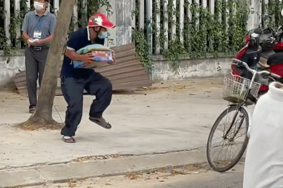 Người đàn ông Đà Nẵng nhảy cẫng lên khi được quà từ thiện. Sau khi nhận 5 kg gạo và thùng mì tôm từ nhóm từ thiện, người đàn ông không giấu nổi vẻ vui mừng, ông nhảy lên hạnh phúc cho tới lúc đem quà ra xe.