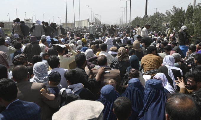 Người dân tập trung gần khu vực quân sự của sân bay Kabul, Afghanistan, hôm 20/8. Ảnh: AFP.