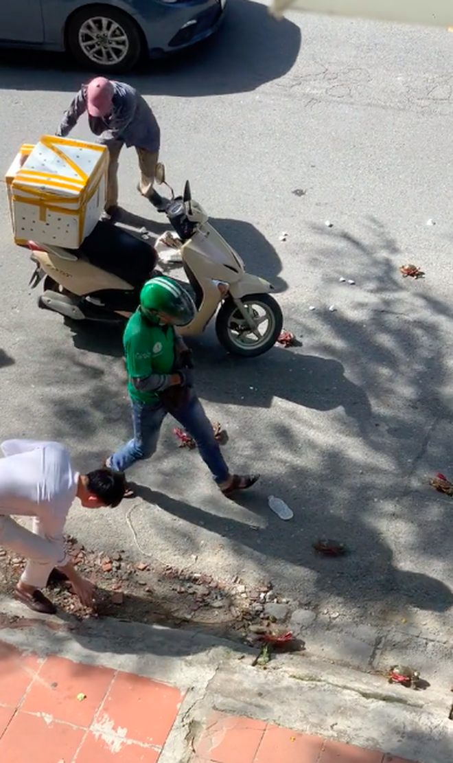 Chuyện là đang chở thùng cua phía sau xe chuẩn bị giao cho khách, anh shipper chẳng biết gặp sự cố gì mà lại khiến cả đàn cua "xổng chuồng" hết xuống đường. Thấy cảnh thanh niên lúi húi đi bắt từng con cua cho lại vào thùng, một cô gái đứng phía trên đã quay video lại.