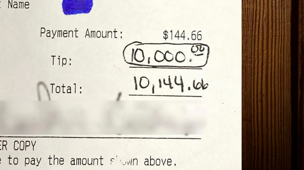 Nhà hàng cũng nhanh chóng chia sẻ câu chuyện tử tế này trên trang Facebook của mình kèm theo hình ảnh 10.000 USD tiền tip "không phải là giấc mơ", thu hút sự chú ý lớn từ dân mạng. Thông qua hình ảnh tờ hoá đơn, có thể nhận ra, giá trị bữa ăn của vị khách hàng hào phóng là 144,66 USD (3,2 triệu đồng) nhưng số tiền tip anh cho đi thì hơn thế rất nhiều lần.
