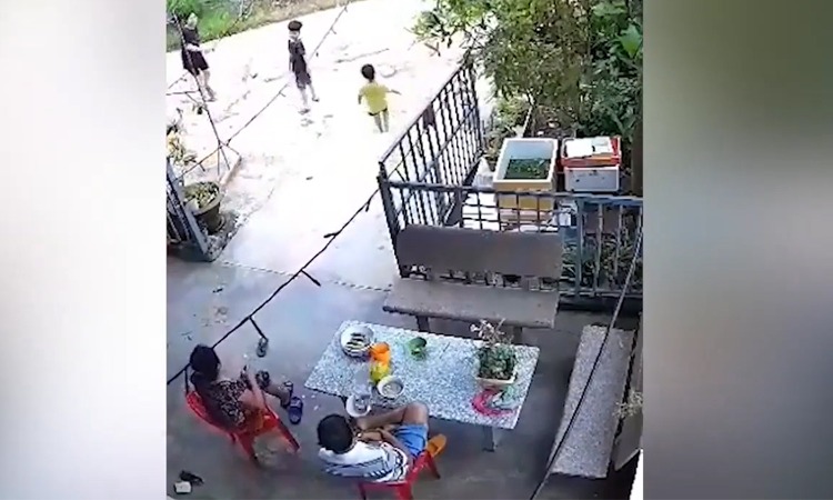 Quả bóng chệch hướng vào nhà, tông trúng khiến bát cơm trên bàn rơi xuống đất vỡ tan.