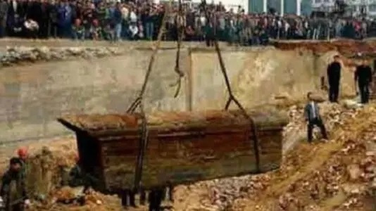 Chiếc quan tài của Lý Liên Anh được đưa ra khỏi lăng mộ. Ảnh Blibili