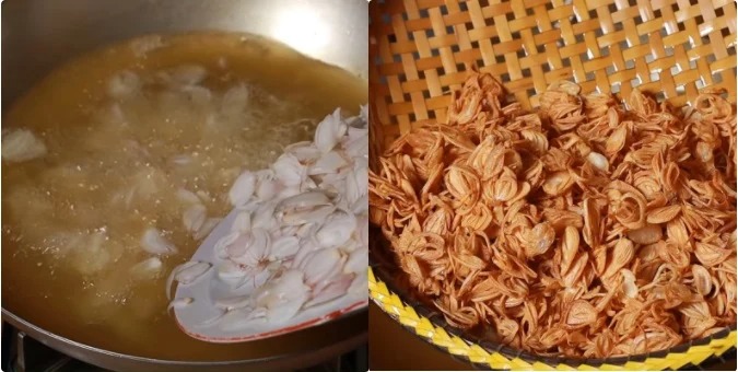 - Sau khoảng 15 phút hành bắt đầu vàng thì vớt nhanh hành để ra rổ. Dàn đều hành để hành nhanh nguội và tắt bếp.