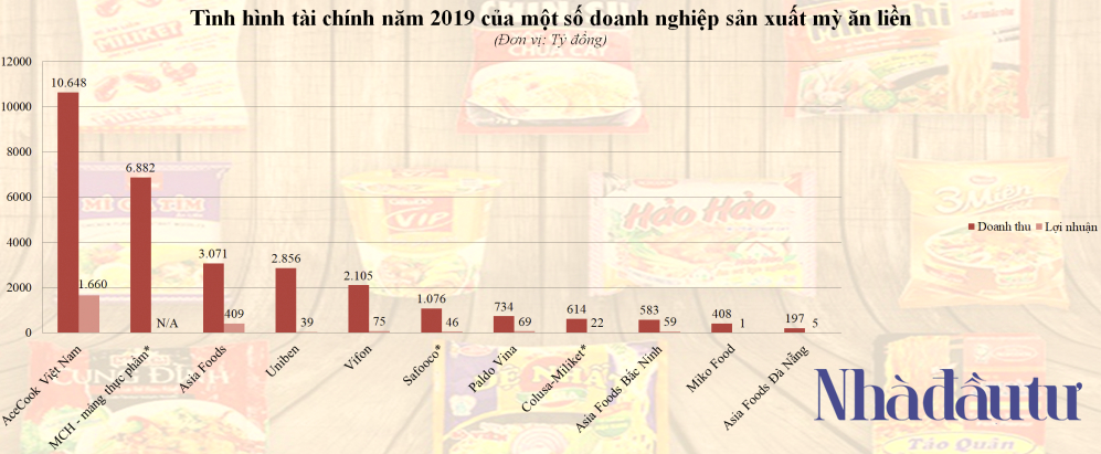 Đứng đầu về thị phần, không ngạc nhiên khi CTCP Acecook Việt Nam đứng quán quân cả về mặt doanh thu/lợi nhuận. Trong năm 2019, doanh thu công ty đạt 10.647 tỷ đồng, lãi sau thuế 1.660 tỷ đồng, tăng lần lượt 27% và 80% so với năm 2016, cho thấy biên lợi nhuận của Acecook cũng tăng rất nhanh những năm qua, và vượt trội so với các doanh nghiệp cùng ngành.