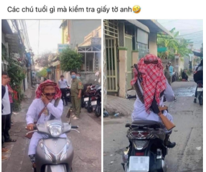 Dân mạng chia sẻ 2 bức ảnh về 1 người đàn ông cải trang thành người theo đạo Hồi. Thu hút sự chú ý của nhiều người. Theo đó, người đàn ông này mặc áo dài trắng, khăn sọc đỏ, không đeo khẩu trang và đeo súng kèm theo băng đạn, chạy xe máy mang biển Cần Thơ ngoài đường.