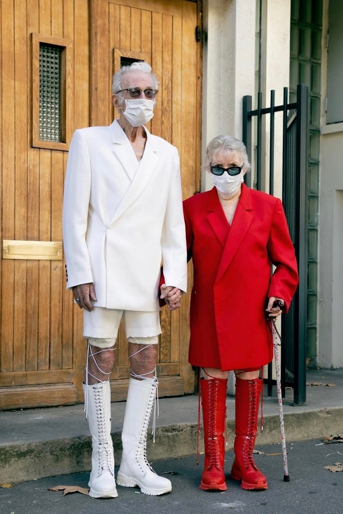 Marie-Louise (85 tuổi) và René Glémarec (86 tuổi) nắm tay nhau xuất hiện tại các tuần thời trang với đồ đôi phong cách phi giới tính.
