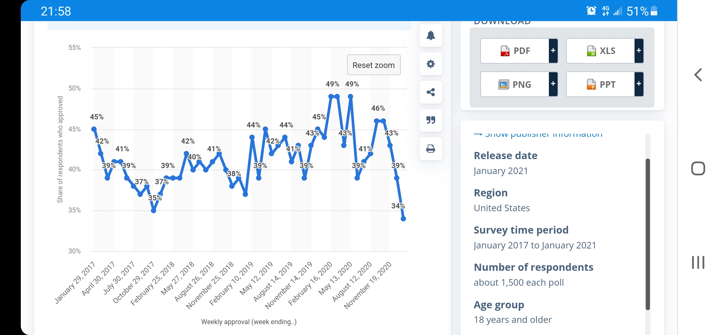 Tỷ lệ người ủng hộ Tổng thống Biden giảm liên tục trong 3 tháng qua, hồi tháng 8 là 54% và tháng 7 là 59%. Đây là hậu quả của việc không xử lý tốt cuộc di tản khỏi Afghanistan, các nhân viên tuần tra biên giới tấn công người tị nạn Haiti, diễn biến của đại dịch COVID-19 và những nỗ lực của ông Biden trong việc thương lượng các chính sách kinh tế, cơ sở hạ tầng và thuế thông qua các hội nghị.
