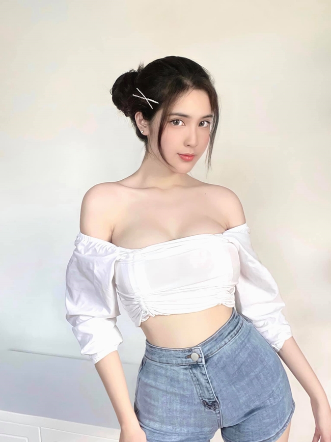 Hot girl Quảng Ninh Dạ thảo chọn mặc quần short cạp cao cùng áo dáng ngắn.
