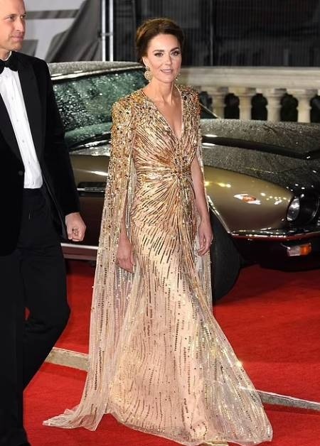 Kate tự tin để hai tay thoải mái khi diện bộ đầm nổi bật của Jenny Peckham cùng chồng dự công chiếu phim 'No Time to Die' hồi tháng 9. Ảnh: PA