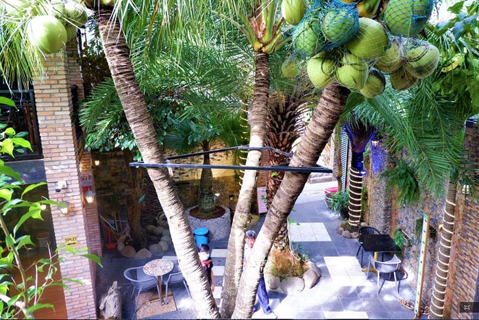 Bên cạnh khu nhà toàn vàng, ngôi nhà còn có một khu sân vườn rộng để làm nơi khách ngồi uống cà phê, ngắm cây cối. Khu vực này cũng đươc anh Trung đầu tư, tìm những loại cây quý về trồng, hàng trăm tấn sỏi đá được sắp xếp tỉ mỉ để tạo nên không gian vô cùng lạ và đẹp mắt. Anh cho biết: “Sở dĩ thời gian thi công lâu là vì phải tốn rất nhiều thời gian sưu tầm các vật dụng trang trí, cây cối độc lạ… Đồng thời, anh muốn tất cả phải được chuẩn bị tỉ mỉ, kiên trì, từ thiết kế đến phối trộn và trang trí… sao cho hoàn hảo nhất”.