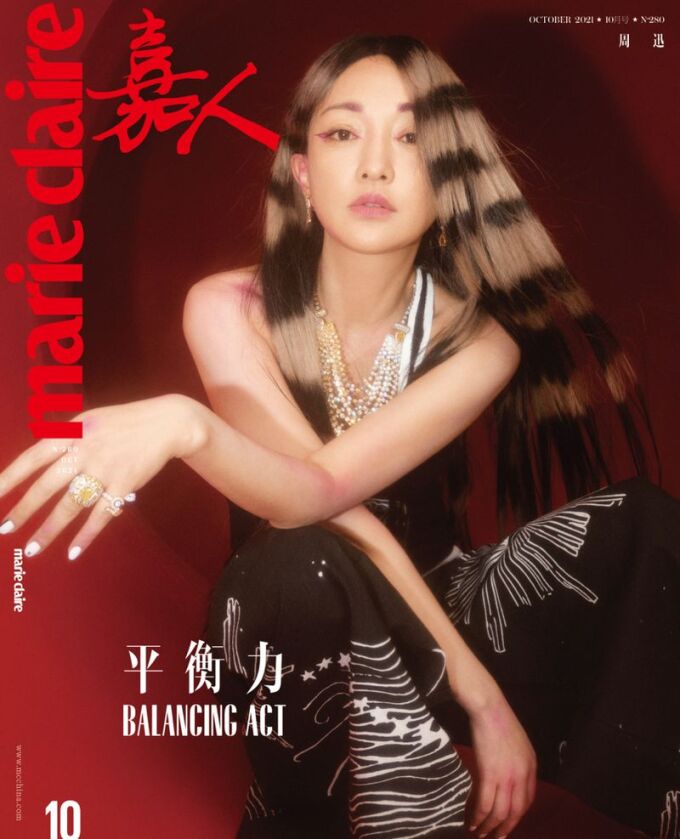 Trên bìa Marie Claire số tháng 10, Châu Tấn hướng đến hình ảnh trẻ trung, cá tính.