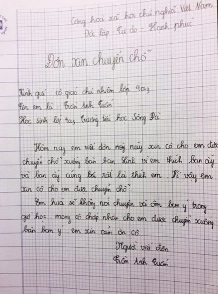Một nam sinh lớp 4 tên Trần Anh Tuấn, trường Tiểu học Sông Đà, Hòa Bình đã viết đơn gửi cô giáo chủ nhiệm xin chuyển chỗ xuống ngồi cùng bàn với bạn Linh. Lý do mà cậu bạn đưa ra khiến nhiều người không khỏi choáng ngợp: "Em thích bạn ấy và bạn ấy cũng rất là thích em".