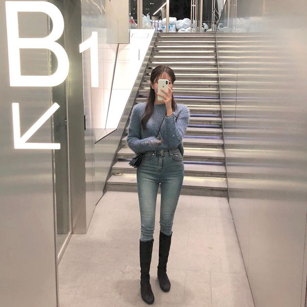 Ngoài phối với váy/đầm, bạn có thể mix boot đùi nhung cùng quần jean. Phong cách này hợp cho những ngày rét đậm.