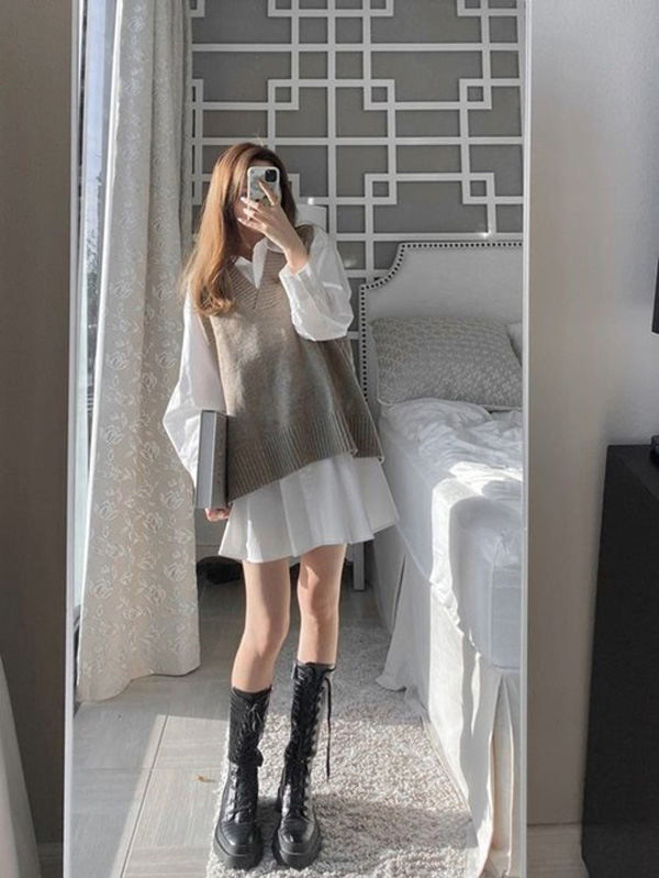 Thích sự tối giản, nàng có chọn trang phục màu trắng cùng boot đùi nhung đen là hoàn hảo.