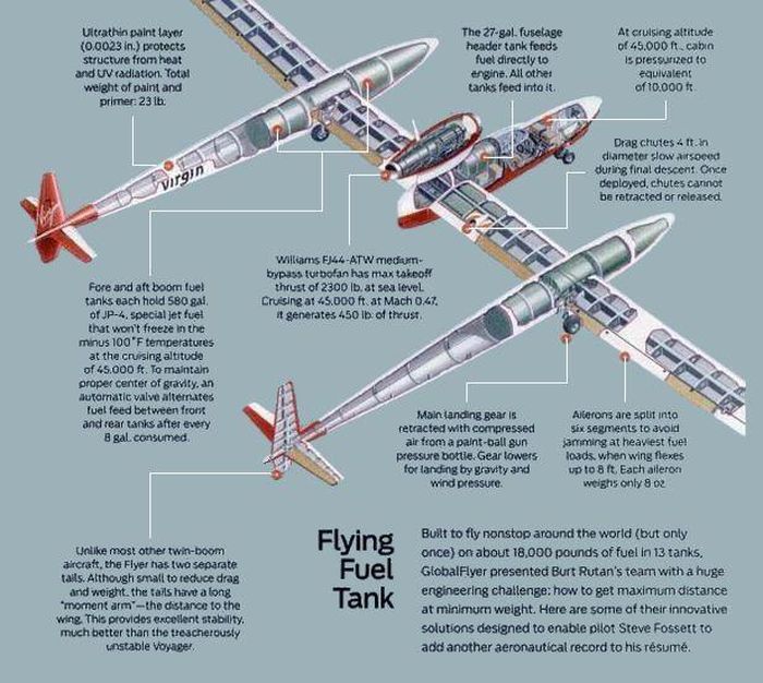 Về cơ bản chiếc máy bay đặc biệt này là một thùng nhiên liệu biết bay. Mọi chỗ trống có thể đều được sử dụng để chứa nhiên liệu và hầu hết các công nghệ máy bay tiên tiến đã bị bỏ qua nhằm giảm trọng lượng.
