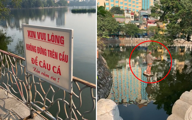 Hoá ra cũng có người muốn câu cá ở đây. Thế nhưng vì đã có biển cấm đứng câu trên cầu, một người đàn ông liền nghĩ ra cách "lách luật" khiến ai cũng phải bật cười. Đó chính là... đứng luôn trên mặt nước.