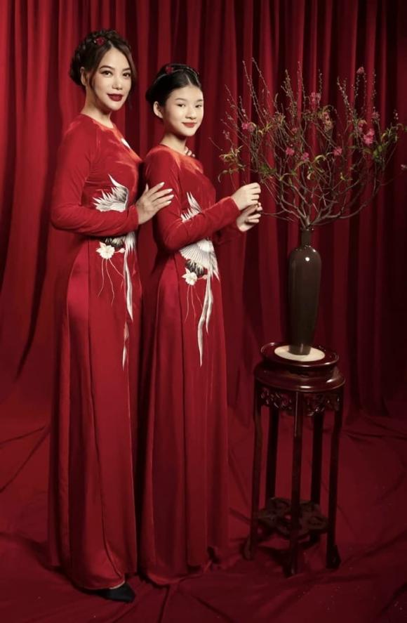 Trên trang cá nhân, Trương Ngọc Ánh tung ảnh con dài diện áo dài đỏ, khoe nhan sắc xinh đẹp. Ở tuổi 14, Devon nổi bật về chiều cao và sắc vóc, tạo dáng tự tin trước ống kính.
