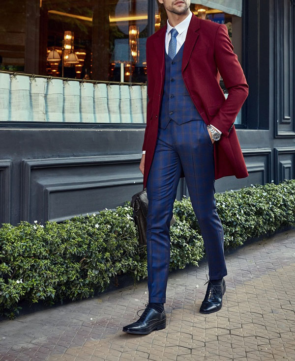 Chọn áo choàng đỏ dễ hơn là phối các item màu đỏ khác. Các chàng nên chọn áo khoác mùa đông màu đỏ tía hoặc đỏ đậm là phù hợp. Bạn có thể phối áo choàng đỏ với bộ suit màu xám và chiếc áo len màu trung tính.