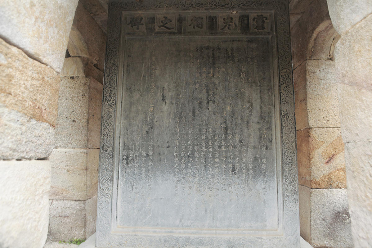 Bia đá trong khu lăng mộ khắc nội dung tóm lược công đức của tướng công Ngọ Công Quế đối với quê hương, đất nước.