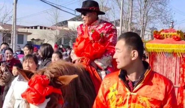 Từ đoạn clip có thể nhìn thấy, cụ ông mặc bộ đồ chú rể màu đỏ sặc sỡ, trước ngực có đeo chùm hoa kết hỷ bắt mắt, cưỡi trên con ngựa lớn vừa đi vừa không ngừng vẫy tay với những người xung quanh, khiến được dân mạng bàn tán xôn xao về một hôn lễ của cặp đôi lệch tuổi ở Trung Quốc .