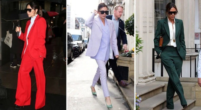 Victoria không gò bó bản thân trong những bộ suit công sở nhàm chán. Cô thể hiện tuyên ngôn thời trang thông qua các kiểu suit với màu sắc nổi bật như hồng, vàng, tím, xanh... Nhà thiết kế cũng thường chọn dáng suit suông rộng đậm chất menswear, không bao giờ lỗi mốt.