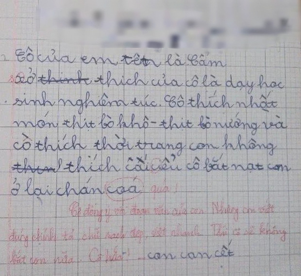 Nhưng nếu dưới góc độ là tả chính cô giáo mình thì sao nhỉ? Mới đây, một bài văn của học sinh tiểu học được chia sẻ trên mạng xã hội đã khiến cho không ít người cười ra nước mắt vì màn bóc phốt cô giáo không hề nể nang. Cuối đoạn văn còn không quên thêm 2 từ cảm thán "chán quá!", nội dung cụ thể của đoạn văn như sau: