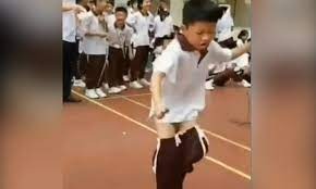 Bé trai không bỏ cuộc dù quần tụt. Dù chiếc quần đã tụt sắp qua đầu gối nhưng cậu bé vẫn quyết hoàn thành màn nhảy dây của mình.