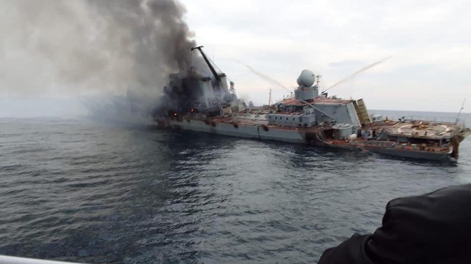 Hình ảnh tàu tuần dương Nga bị bốc cháy và chìm sau đó. Ảnh AP