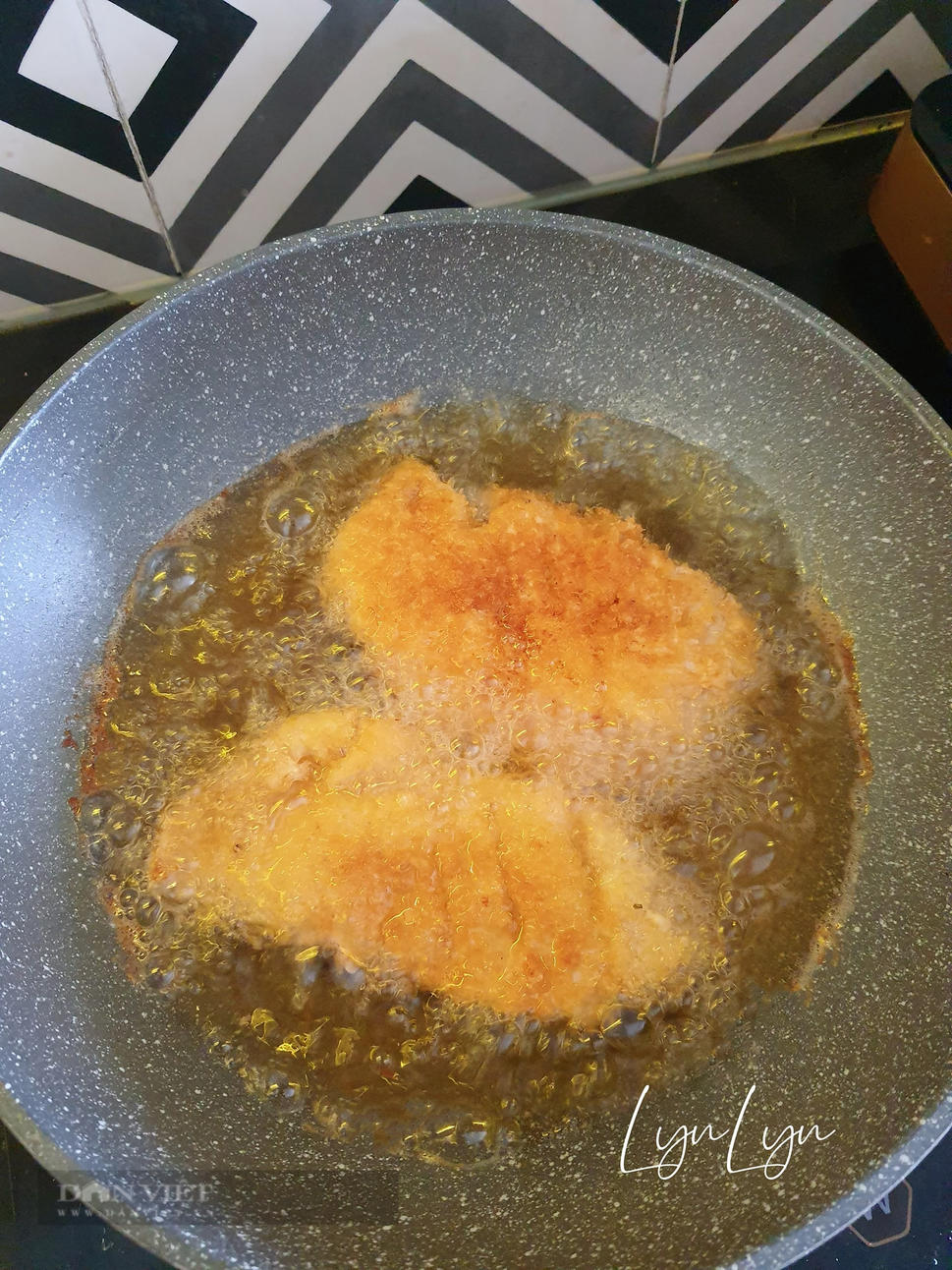 - Nếu là miếng gà to (lạng mỏng), chỉ nên chiên cùng lúc 2 miếng. Nếu là miếng ức gà 1cm được cắt theo bản ngang, thì nên chiên chừng 3 miếng 1 lúc. Không chiên nhiều, sẽ làm giảm nhiệt của dầu, dầu sẽ ngấm vào thịt gà rất nhiều.
