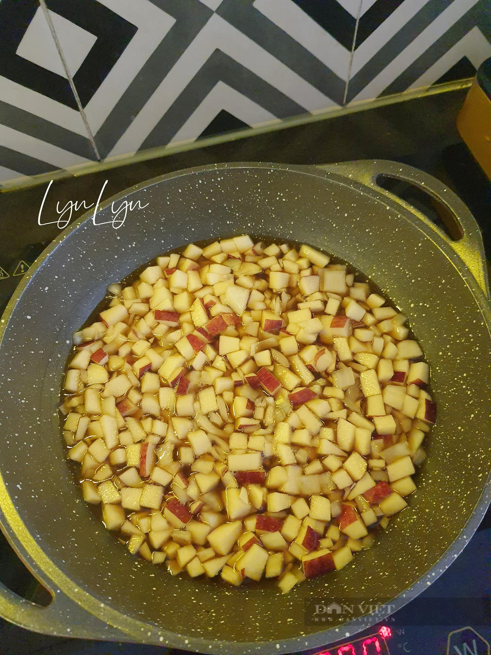 - Cho táo + hành tây + 120ml nước trắng + dầu hào + nước tương + đường nâu vào 1 cái nồi nhỏ