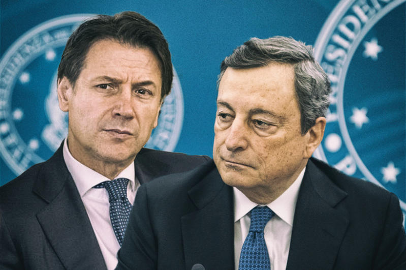 Ông Giuseppe Conte (trái) tuyên bố có khả năng rút khỏi liên minh của Thủ tướng Mario Draghi (phải). Ảnh: Imagoeconomica.