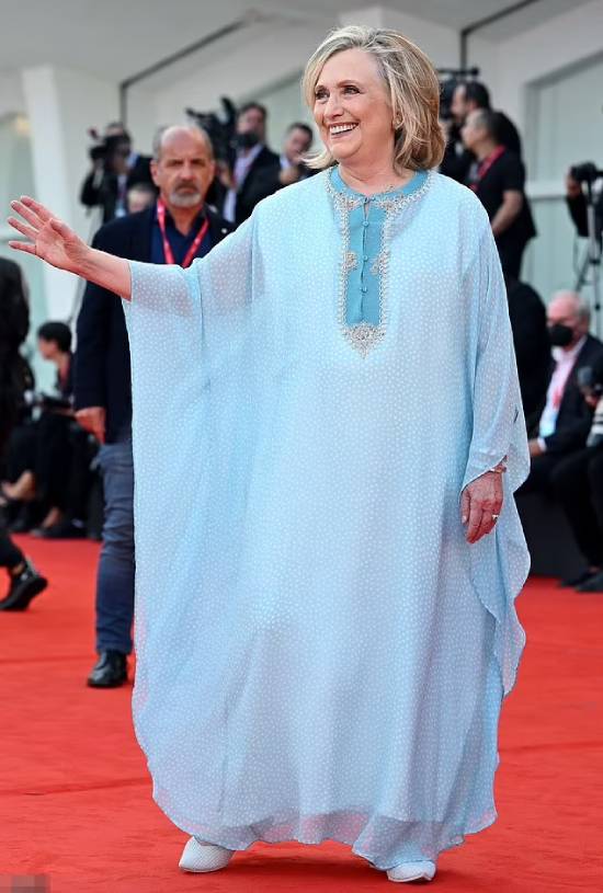 Có mặt ở lễ khai mạc sự kiện, bà Hillary diện chiếc đầm caftan màu xanh nhạt thay cho bộ suit đặc trưng, kết hợp giày bệt mũi nhọn. Nữ chính trị gia 74 tuổi đeo vòng tay trong suốt, hoa tai bạc và chiếc vòng cổ lấp lánh có chữ "Jasper" - tên cháu trai nhỏ nhất của vợ chồng bà. Liên hoan phim Venice năm nay mở màn bằng tác phẩm White Noise (Tiếng ồn trắng) của đạo diễn Noah Baumbach.
