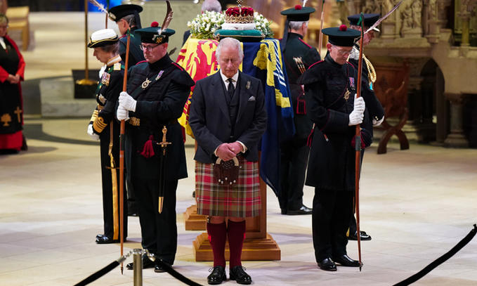 Quốc vương Charles III cùng ba người em đứng gác bên linh cữu Nữ hoàng Anh Elizabeth II trong buổi cầu nguyện tại nhà thờ St. Giles ở Edinburgh.