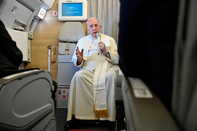 Giáo hoàng Francis trả lời truyền thông trên chuyến bay trở về Rome, ngày 15/9. Ảnh: AFP.
