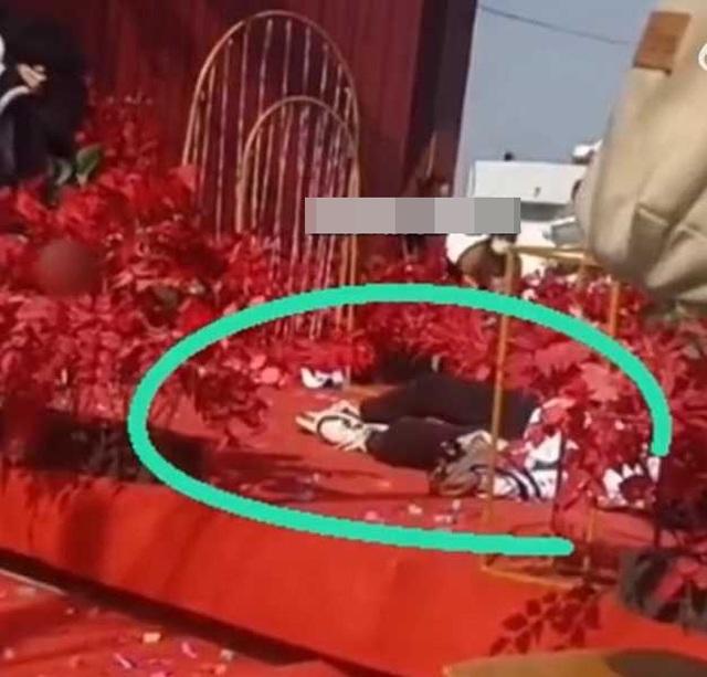Không những thế, người phụ nữ áo trắng này còn nằm ra hẳn sân khấu đám cưới để ăn vạ, ngăn cản không cho hôn lễ được tiếp tục diễn ra.